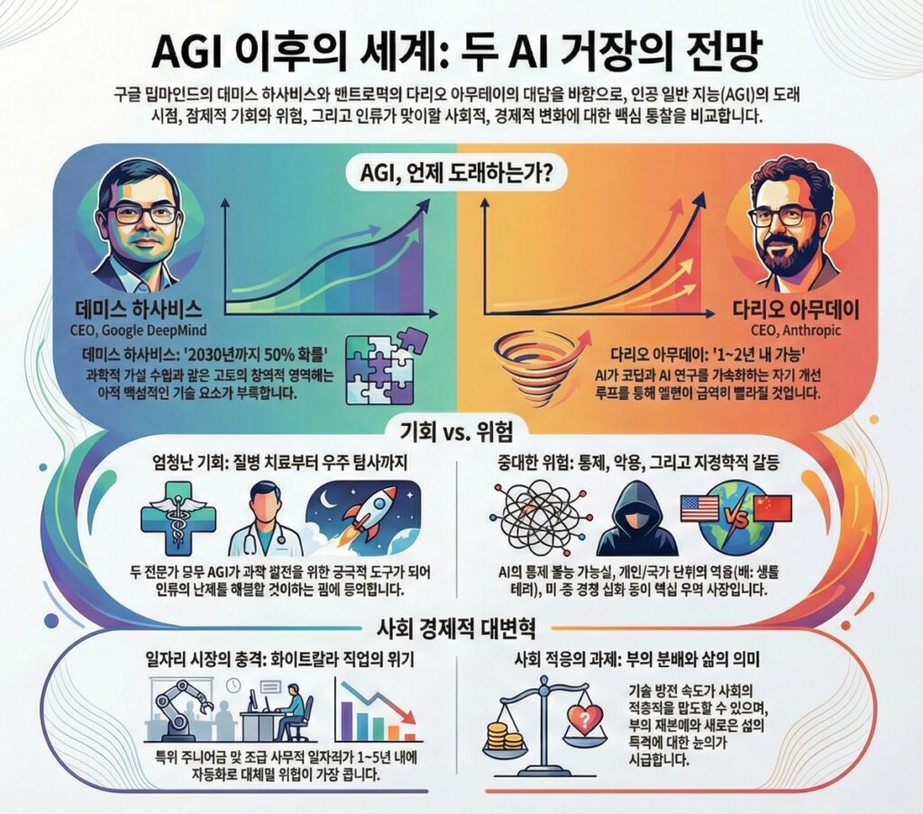 Google DeepMind의 데미스 허사비스(Demis Hassabis) CEO와 Anthropic의 다리오 아모데이(Dario Amodei) CEO간의 대담을 분석하여, 인공일반지능(AGI)의 도달 시기, 경제적 파급 효과, 기술적 위험 및 지정학적 역학 관계에 대한 핵심 통찰을 정리한 브리핑 보고서