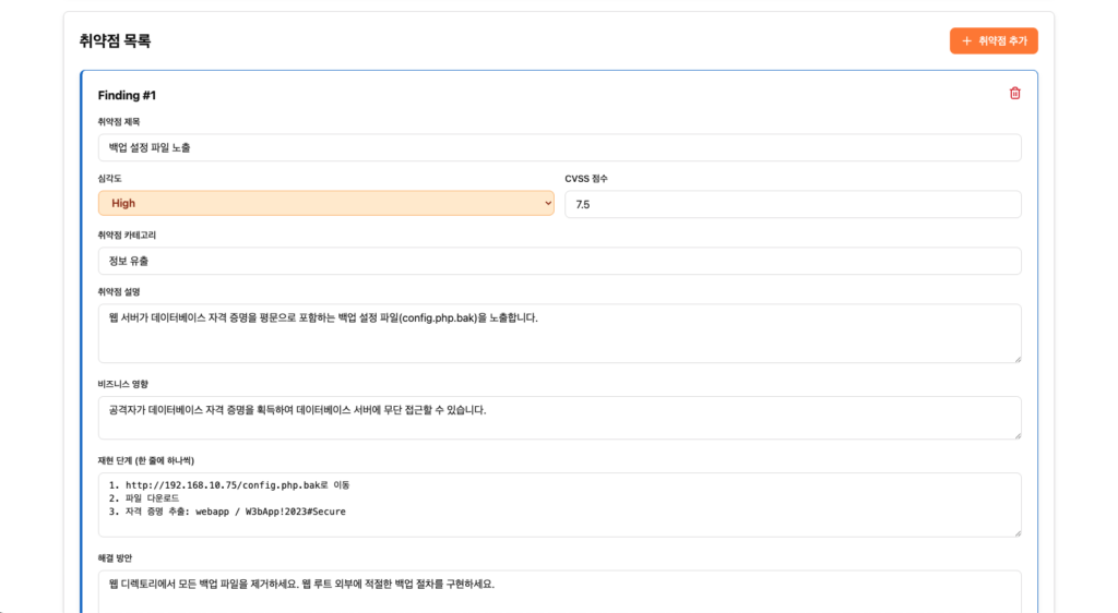 • 취약점별 구조화된 설명 및 공격 시나리오 정리