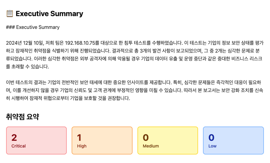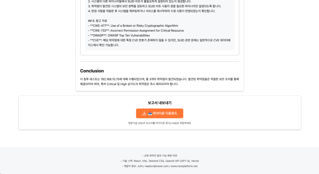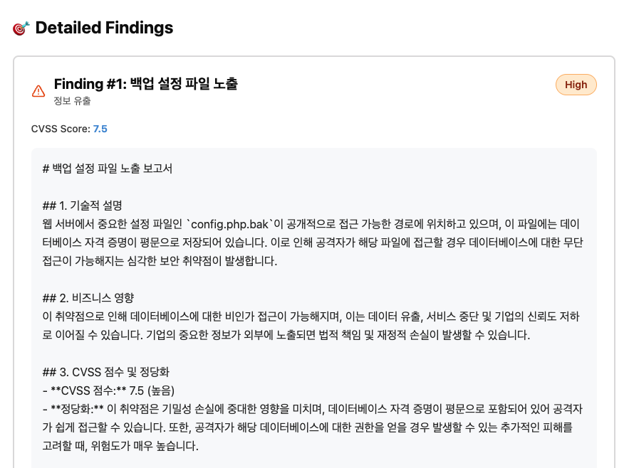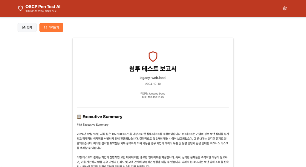 이 앱은 각 결과를 공격 흐름(Attack Path) 관점에서 재구성하고, 취약점의 의미·위험도·재현 절차·권장 대응 방안을 논리적으로 연결해줍니다. 덕분에 사용자는 보고서의 “초안 작성”이 아닌, 검증·보완·개선에 집중할 수 있습니다.