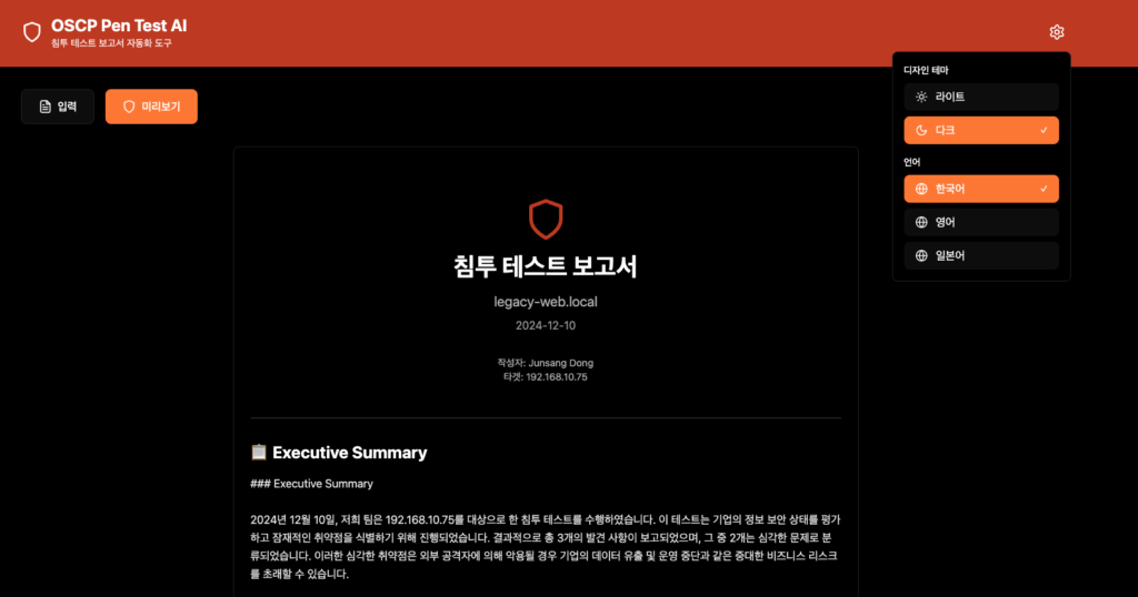 OSCP Pen Test AI는 “침투 테스트의 본질은 문서 노동이 아닌, 공격과 분석”이라는 문제의식을 구체화한 것입니다. OSCP Pen Test AI를 이용하여 침투 테스트 결과를 더 빠르고, 더 일관되며, 더 교육적으로 정리하세요.