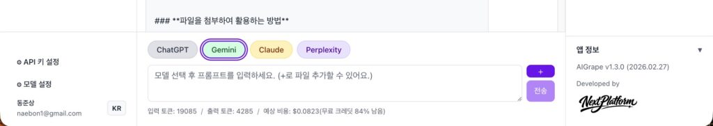 • 프롬프트 입력창 바로 위 GPT, Gemini, Claude, Perplexity 옵션 중 선택