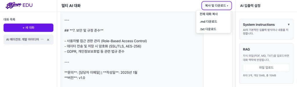 • 전체 대화는 AI 서비스 내 호환성 높은 .md 또는 .txt 파일 형식으로 다운로드 가능