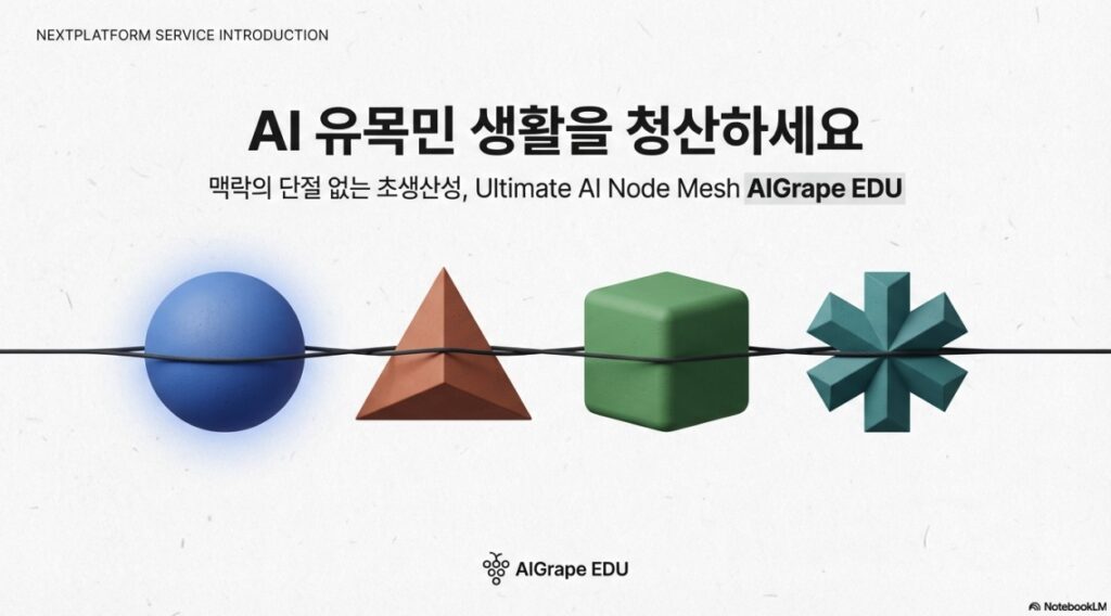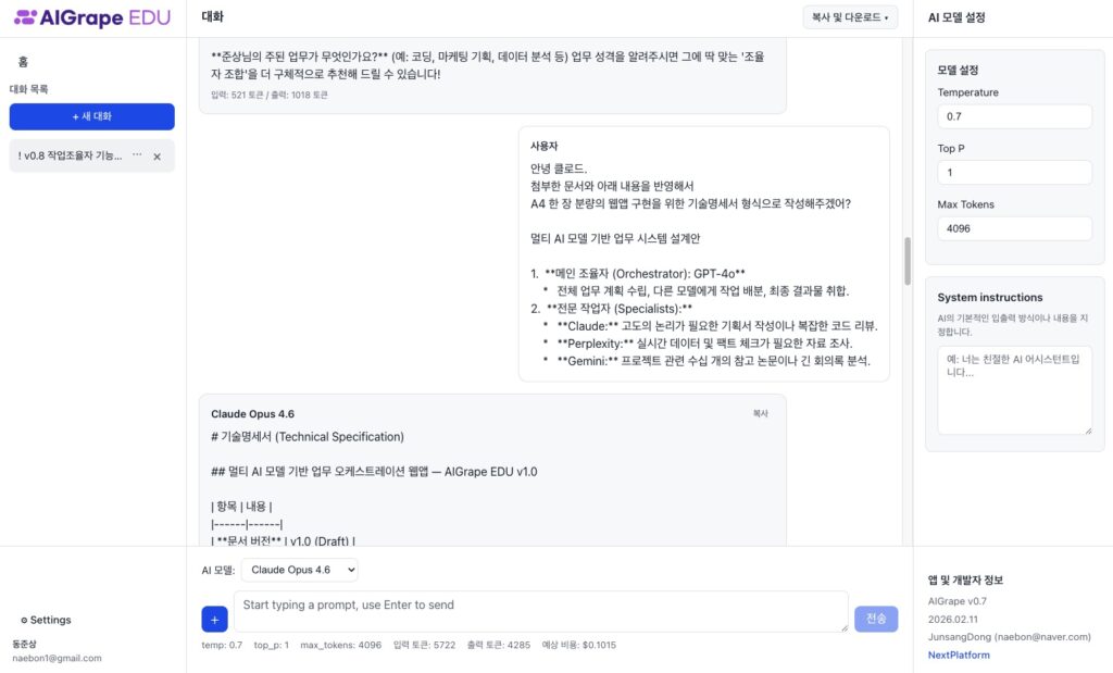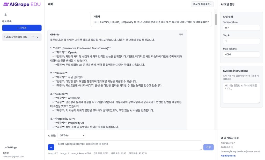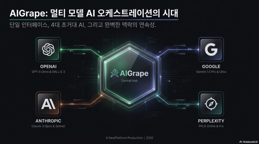 - AIGrape는 넥스트플랫폼(NextPlatform)이 개발한 멀티 AI 통합 플랫폼이며, 사용자는 자신이 원하는 GPT, Gemini, Claude, Perplexity 등 현존하는 최고 성능의 생성형 AI 모델들을 단일 인터페이스에서 교차 사용 가능