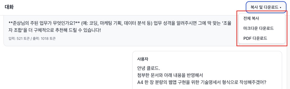 중앙 패널 상단에 있는 ‘복사 및 다운로드’ 버튼을 이용해서 대화 콘텐츠를 옮기거나 저장할 수 있습니다.