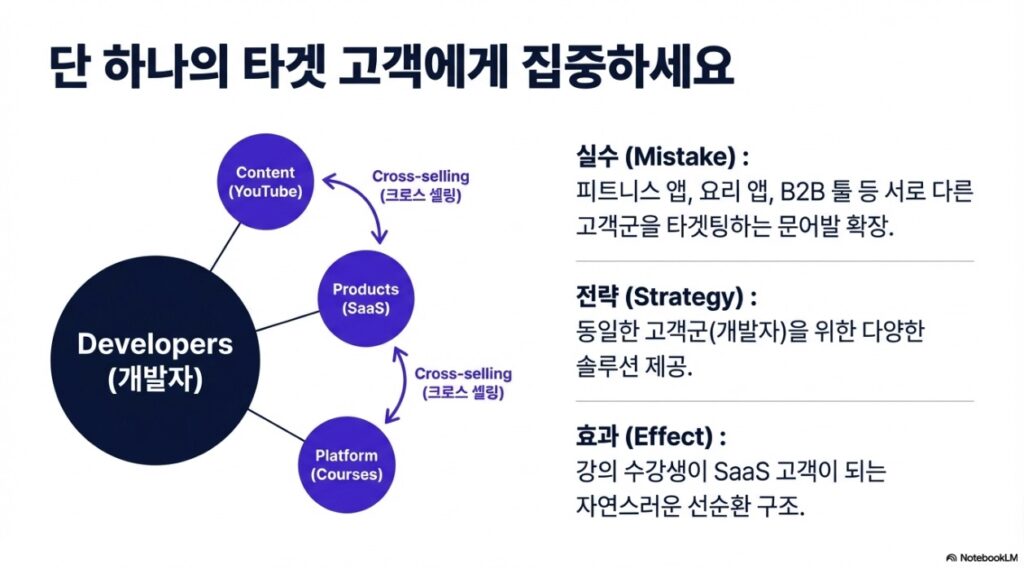 많은 개발자가 범하는 실수는 서로 다른 고객군을 대상으로 하는 여러 프로젝트를 동시에 진행하는 ‘산만한 개발(Scatterbrain development)’입니다. 진정한 복리 효과는 단일 니치(Single Niche) 생태계 내에서 자산을 쌓아 올릴 때 발생합니다.