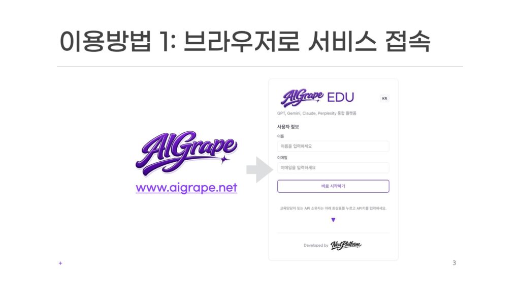 AIGrape 사용자는 아래 2단계 절차에 따라 접속 즉시 서비스 이용을 시작할 수 있습니다.