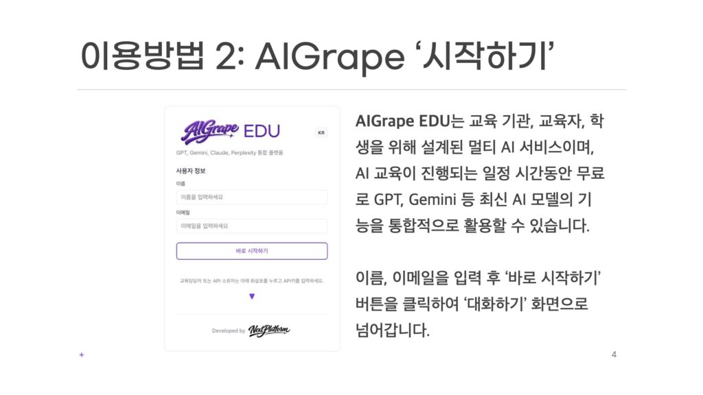www.aigrape.net접속 - 정보 입력: 사용자 이름, 이메일 입력 후 ‘바로 시작하기’ 버튼 클릭