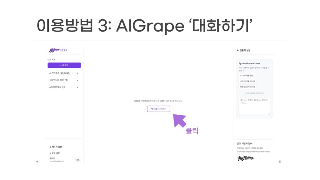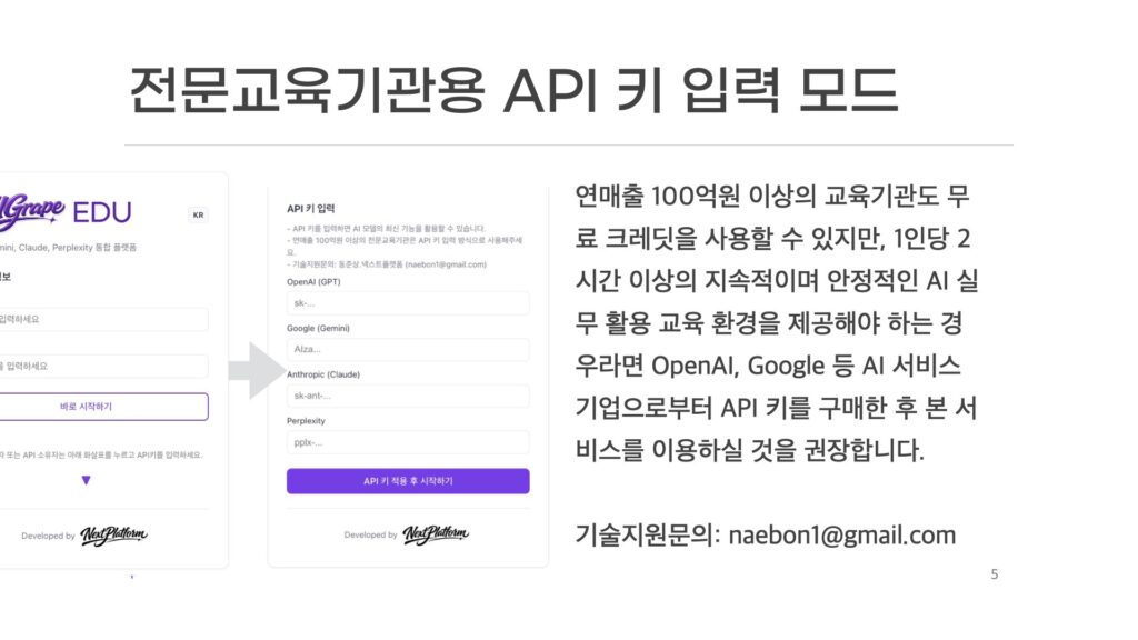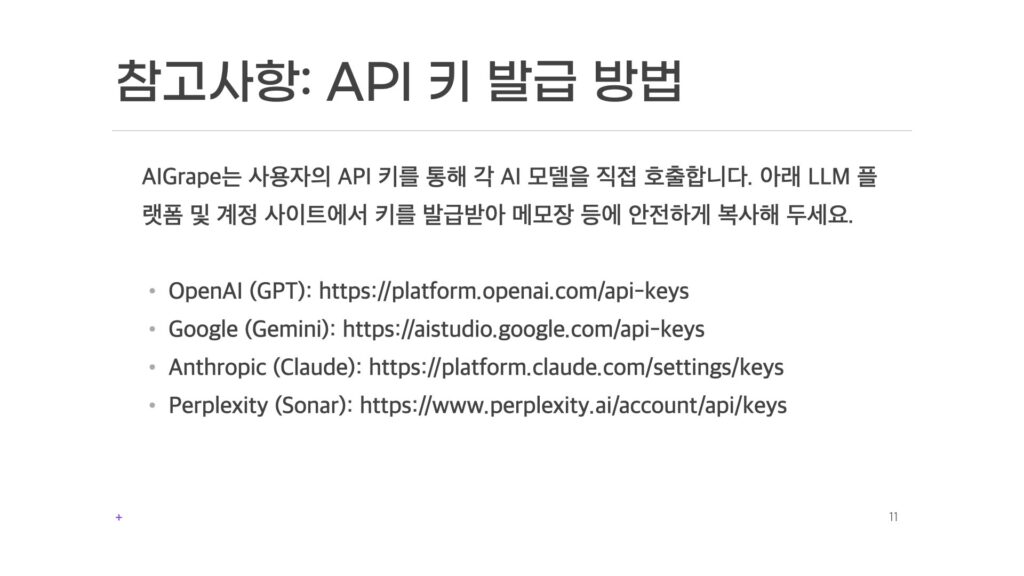 전문교육기관의 교육운영자 등 사용자는 OpenAI Platform, Google AI Studio 등 개발자 지원 페이지에서 GPT, Gemini 등을 프로그램 방식으로 사용할 수 있는 API 키를 발급받은 후 AIGrape의 시작화면에서 ‘API 키 입력’ 후 사용을 권장합니다.