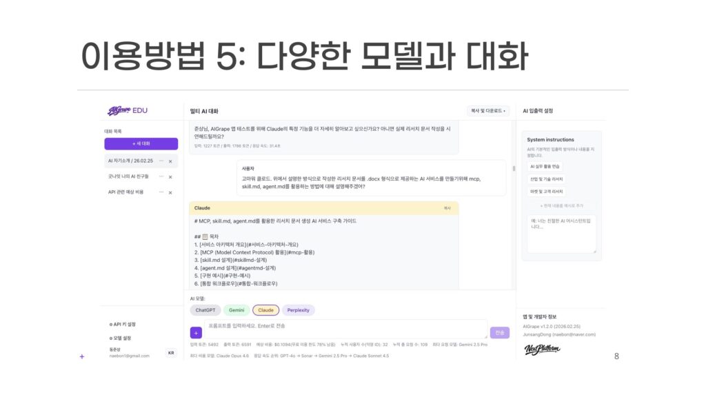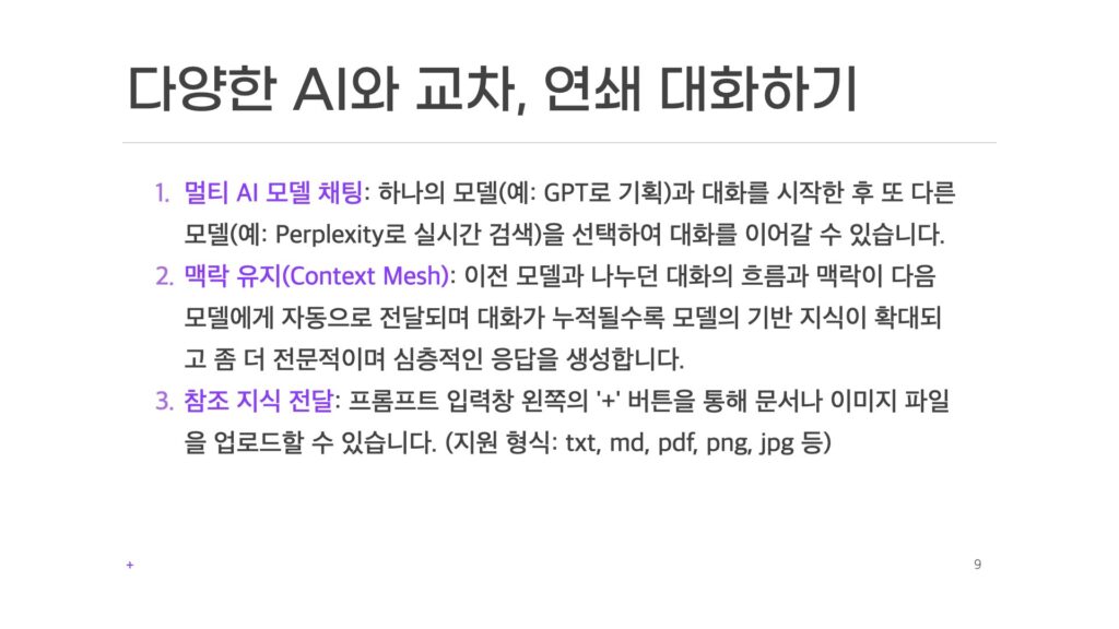 - GPT, Gemini, Claude, Perplexity 등 최신의 AI 모델을 연계하여