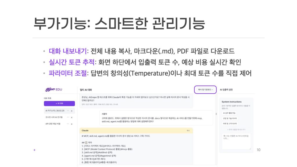 - 결과물 내보내기: 전체 대화 내용을 클립보드에 복사하거나 마크다운(.md) 및 PDF 파일로 다운로드하여 로컬 PC에 저장할 수 있습니다.