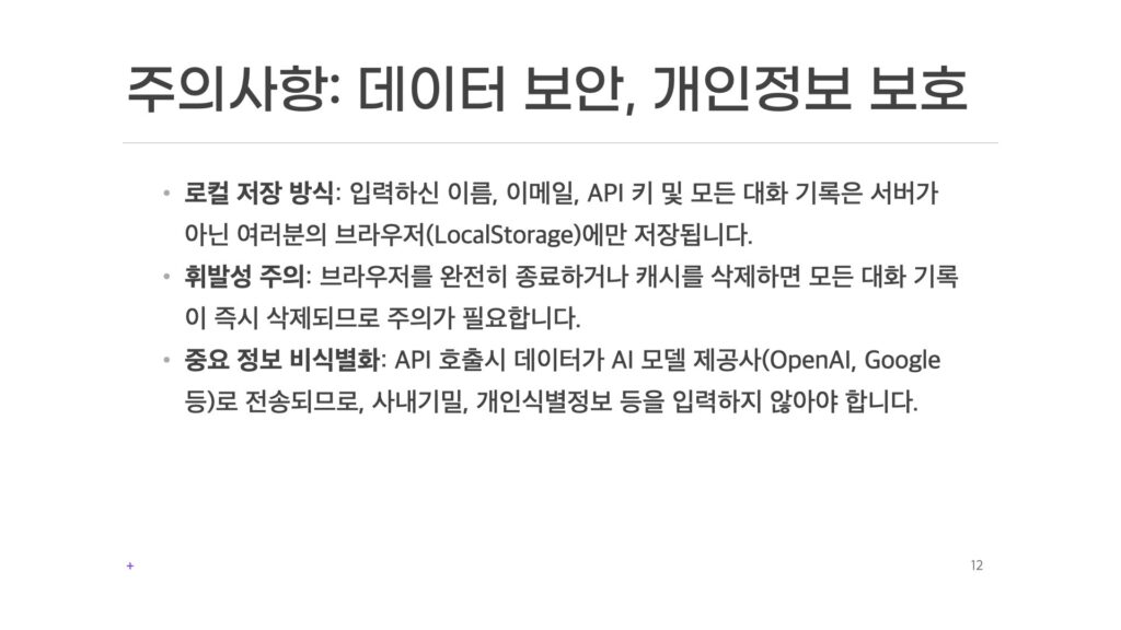 | 주의 사항 | API 호출 시 데이터가 AI 공급사(OpenAI 등)로 전송되므로 사내 기밀 입력 주의 |