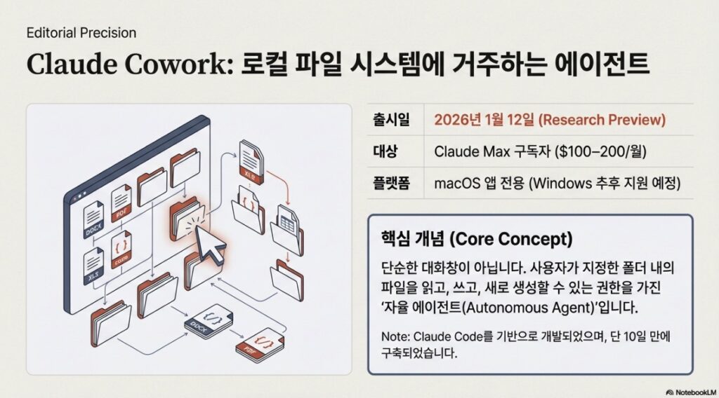 • 기존의 대화형 AI 인터페이스를 넘어, 사용자 컴퓨터의 파일 시스템에 직접 접근하여 자율적으로 과업을 수행 가능