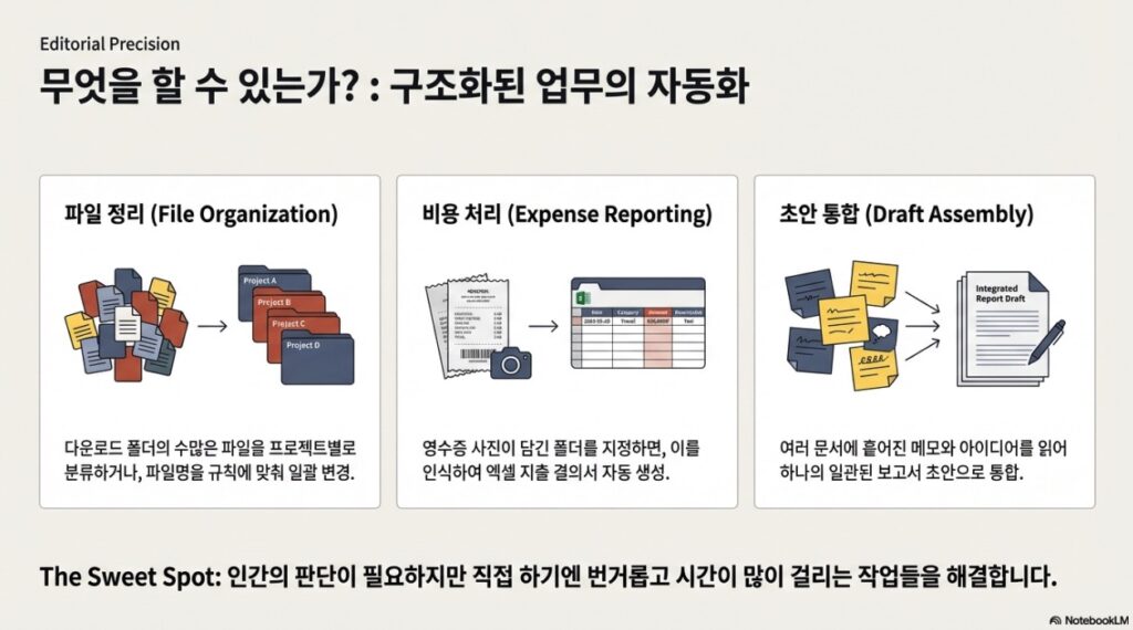 • 파일 조직화 및 일괄 처리: 다운로드 폴더 정리, 프로젝트별 파일 분류, 표준화된 규칙에 따른 대규모 파일 이름 변경 등을 수 분 내에 완료한다.