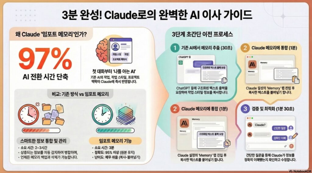 기존의 AI 전환 방식이 수 시간의 재설정과 적응 기간을 필요로 했던 것과 달리, 임포트 메모리는 단 3분 만에 복사-붙여넣기 과정을 통해 마이그레이션을 완료합니다. 이를 통해 작업 효율성 저하를 방지하고, 첫 대화부터 사용자의 직업, 선호도, 프로젝트 배경을 완벽히 이해하는 개인화된 AI 경험을 제공합니다. 본 문서는 임포트 메모리의 주요 기능, 단계별 실행 가이드, 그리고 이를 통한 생산성 향상 효과를 상세히 분석합니다.