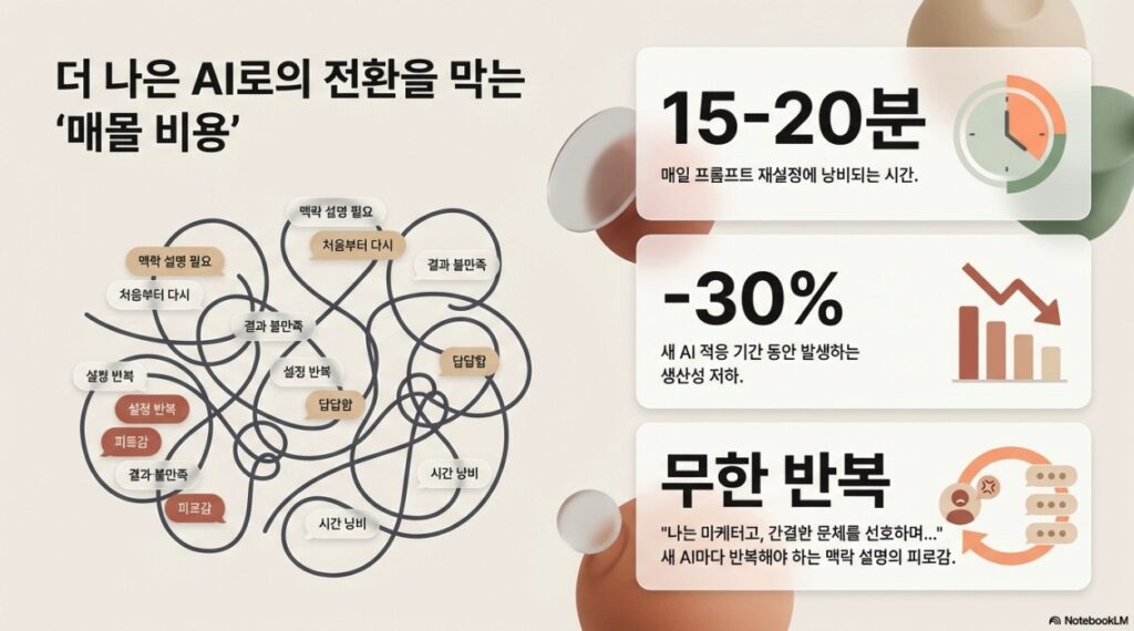 • 반복적인 맥락 설명: 새로운 AI를 사용할 때마다 자신의 직업, 문체, 선호도를 다시 설명해야 하는 피로감.