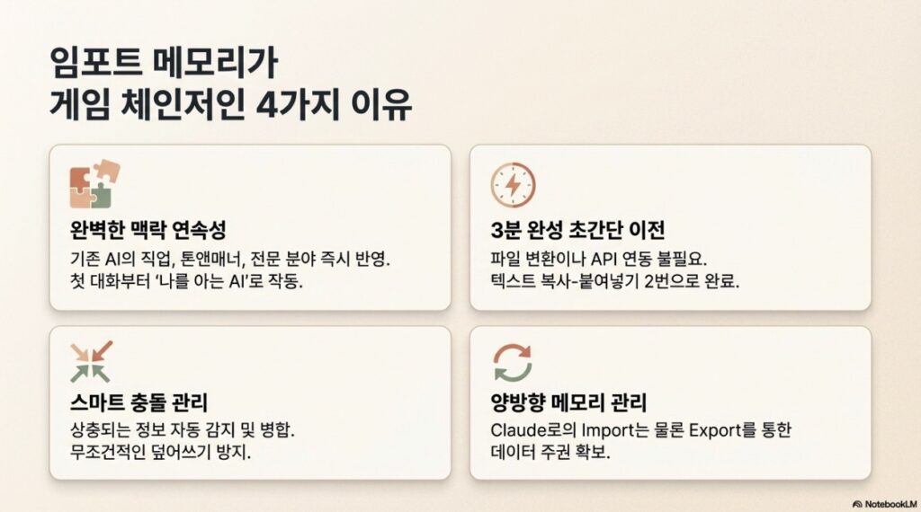 임포트 메모리는 단순한 데이터 이전을 넘어, AI 간의 장벽을 허무는 ‘게임 체인저’ 역할을 수행합니다.
