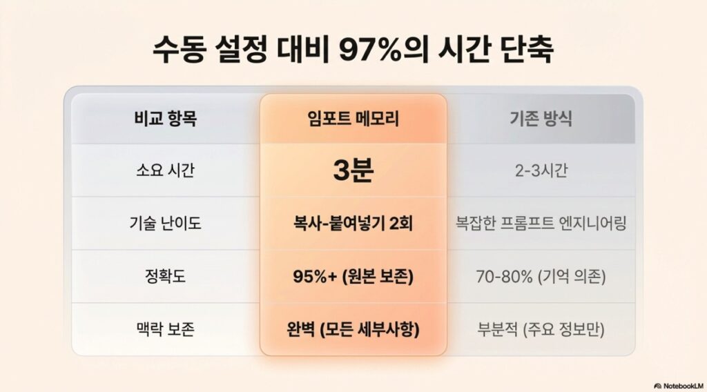 임포트 메모리 도입은 기존 수동 방식 대비 비약적인 시간 절감 효과를 제공합니다.