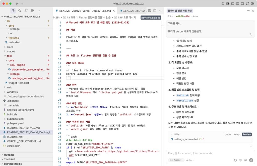 Cursor에서 Flutter 앱 빌드 후 Vercel 배포 디버깅 작업 진행