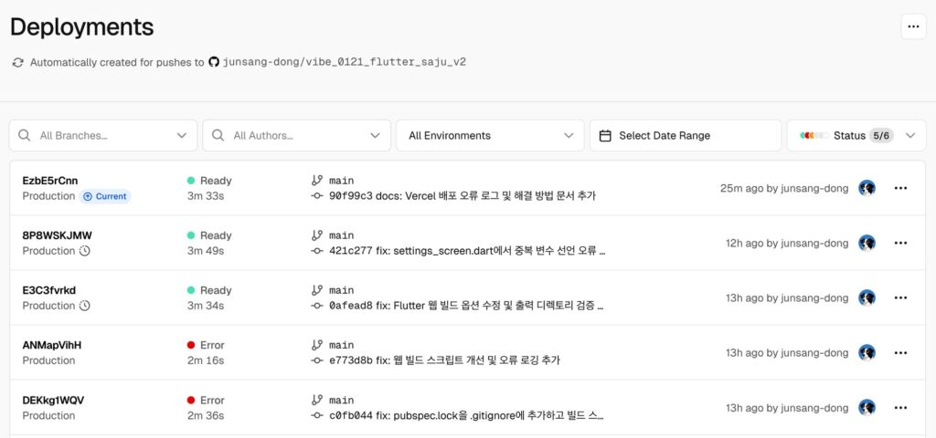 Flutter 웹앱을 Vercel에 배포하는 과정에서 발생한 오류들과 해결 방법을 정리했어요. Cursor로 1차 빌드 후 기본적인 UI 요소의 수정 버전을 Vercel에 배포하는 작업이었고 배포 성공까지 대략 세 시간 정도 소요됐습니다.