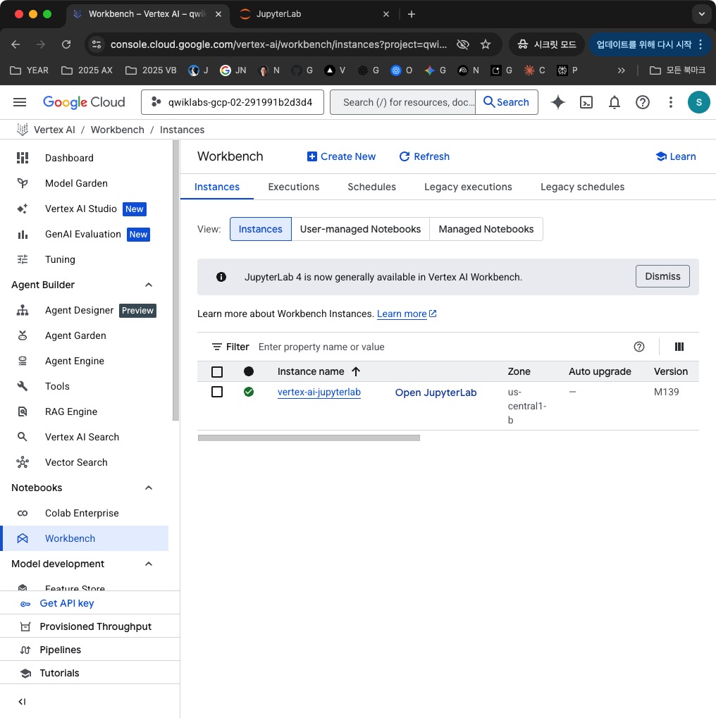 vertex-ai-jupyterlab 인스턴스를 찾아 JupyterLab 열기 버튼을 클릭합니다.