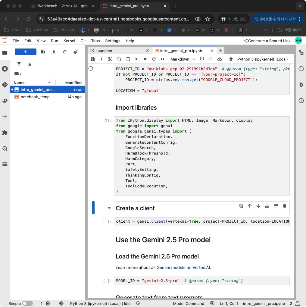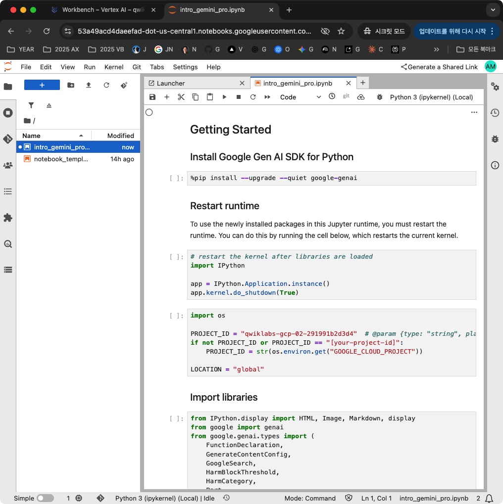 노트북의 시작하기 섹션을 실행합니다. 프로젝트 ID와 위치가 사전 구성되어 있습니다.