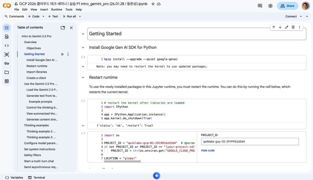 실습 예제 코드 | GCP 2026 클라우드 테크 세미나 | 실습 P1 intro_gemini_pro.ipynb