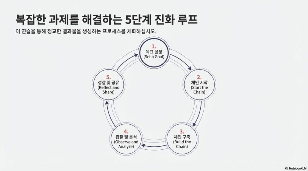 | 성찰 및 공유 | 전체 체이닝 프로세스를 되돌아보고 학습된 내용을 정리하는 최종 단계입니다. | 수행 결과 공유 및 실험 과정에서의 통찰력 도출 |
