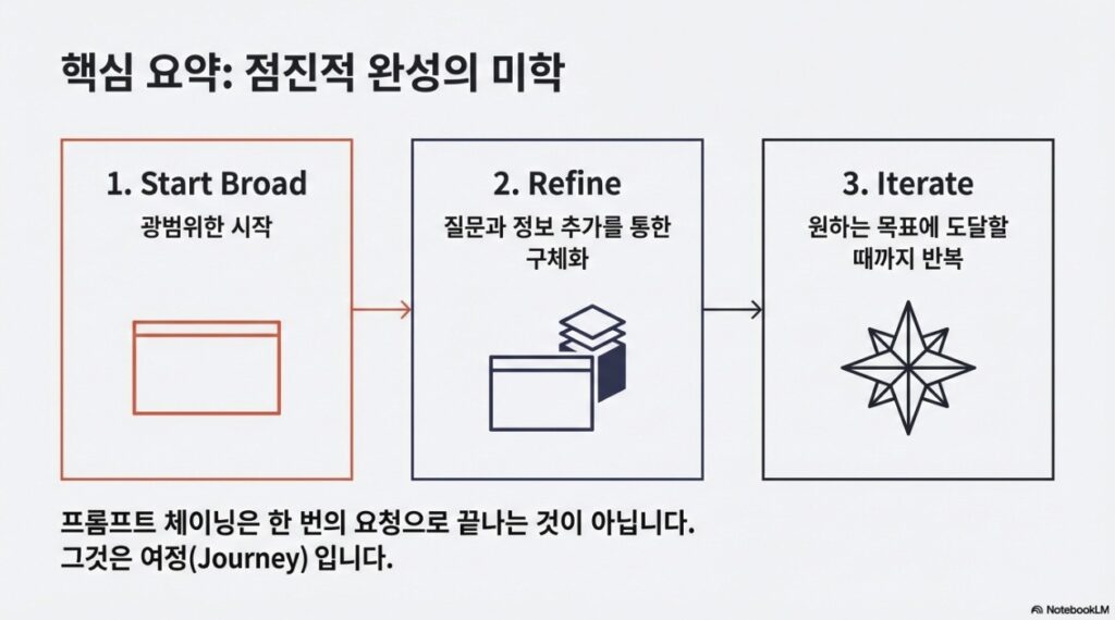 이 기술의 핵심은 광범위한 초기 프롬프트에서 시작하여 명확한 질문, 구체적인 정보 제공, 형식 변경 요청 등을 통해 단계적으로 출력값을 정제하는 것이며, 이를 통해 사용자는 단순한 질의응답을 넘어, AI와의 연속적인 상호작용을 통해 고도로 세련된 결과물을 생성할 수 있습니다.