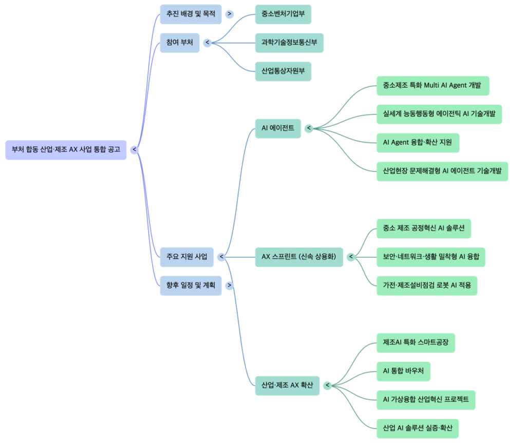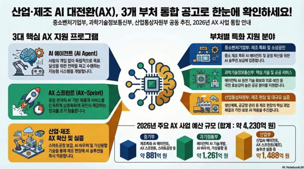 이번 포스트에서는 대한민국 정부가 인공지능(AI) 3대 강국으로 도약하기 위해 추진하는 ‘산업·제조 AI 대전환(AX)’ 사업의 통합 공고 및 세부 추진 계획을 분석합니다.