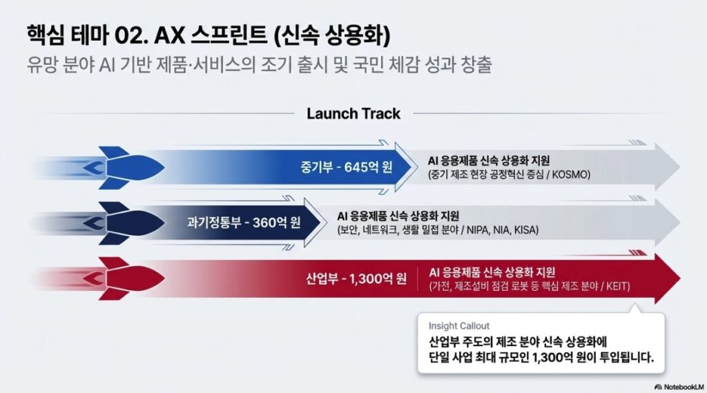 | AX 스프린트 | AI 응용제품 신속 상용화 지원 (중기 제조) | 중기부 | 645억 원 | 스마트제조혁신추진단(KOSMO) |