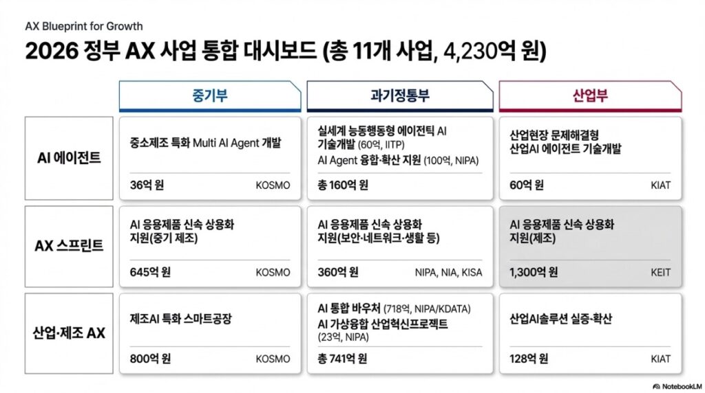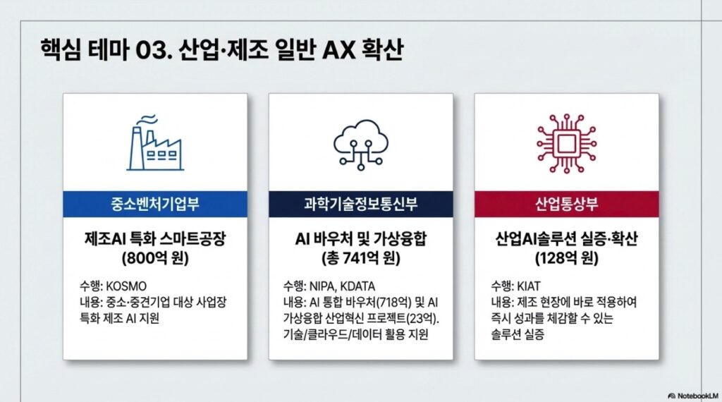 | 산업·제조 AX | 제조AI 특화 스마트공장 | 중기부 | 800억 원 | 스마트제조혁신추진단(KOSMO) |