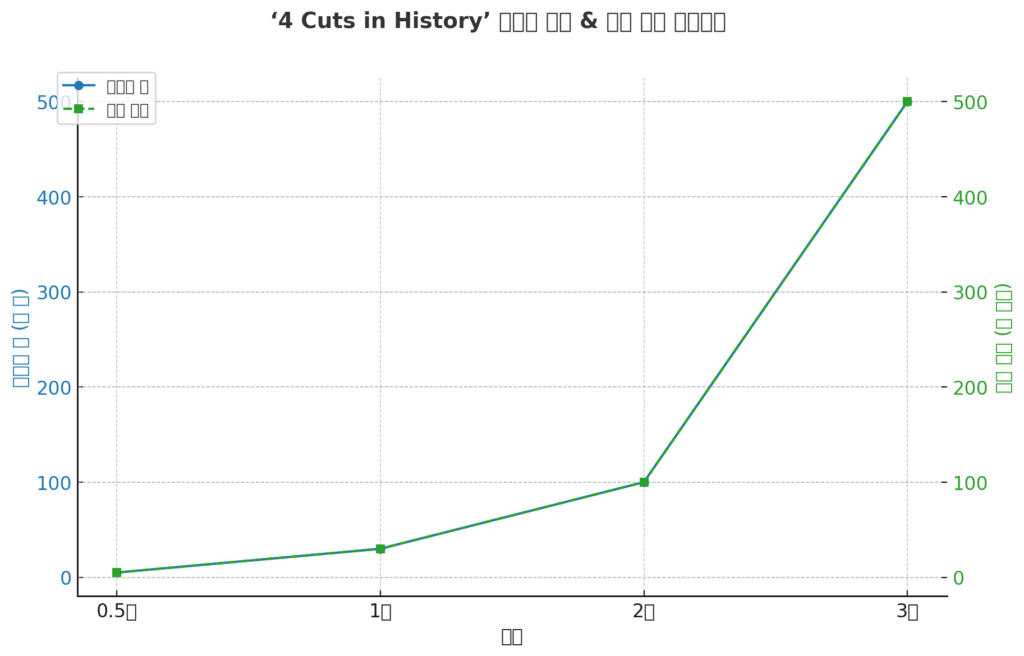 “4 Cuts in History” 앱의 사용자 성장곡선(파란색)과 수익 누적 곡선(초록색) 시각화