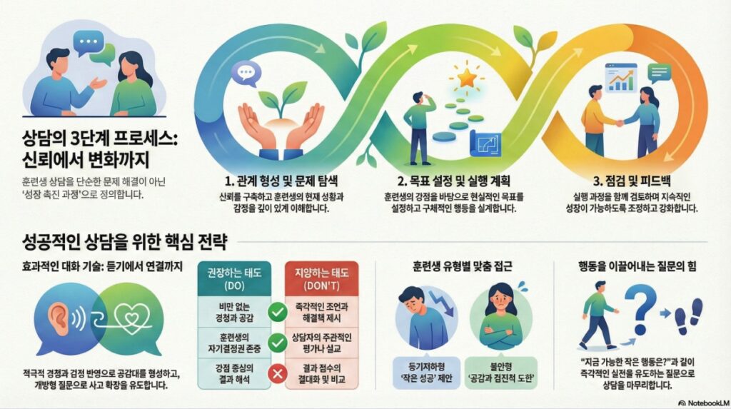본 지침이 강조하는 전체 핵심 메시지는 **”상담은 듣고 이해하는 것에서 시작하여 구체적인 행동으로 연결될 때 완성된다”**는 것이다. 상담자는 구조화된 대화 기술을 숙달하고, 심리검사 등 객관적 도구를 전략적으로 활용하며, 지속적인 사례 분석과 롤플레이 실습을 통해 상담 역량을 강화해야 한다. 궁극적으로 상담은 훈련생이 자신의 잠재력을 발견하고 스스로 변화의 주체가 되도록 돕는 일련의 성장 촉진 과정이다.