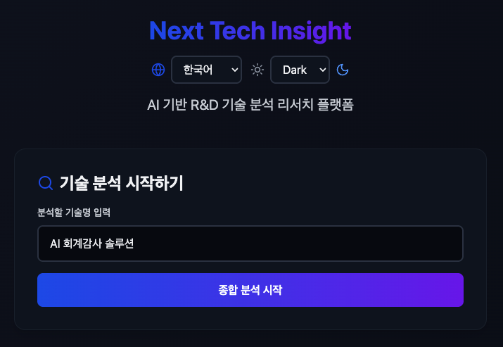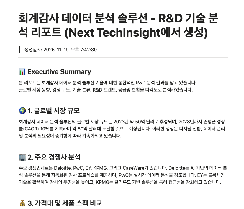 ์ด ์ฑ์ ๋ณต์กํ R&D ๋ฆฌ์์น ๊ณผ์ ์ ์๋ํํด, ์ฐ๊ตฌ์๊ฐ ๊ธฐ์ ํค์๋๋ฅผ ์ ๋ ฅํ๋ฉด ์์ฅ ๋ถ์ โ ๊ธฐ์ ์ฝ๋(KSIC/IPC) โ ๊ฒฝ์์ฌ ๋น๊ต โ ์ธ์ฌ์ดํธ โ ๋ฆฌํฌํธ ์์ฑ ๋ฑ ํต์ฌ์ ์ธ ๋ฆฌ์์น ์์ ์ ์ ์ํ๋ฉด์๋ ์ผ๊ด๋ ๋ฐฉ์์ผ๋ก ์ํํฉ๋๋ค.