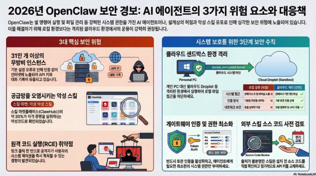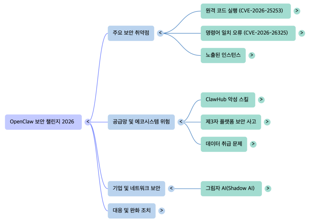 오픈클로(OpenClaw)는 쉘 명령 실행, 브라우저 제어, 파일 관리 등 강력한 시스템 권한을 가진 오픈소스 AI 에이전트로, 그 높은 활용성만큼이나 심각한 보안 취약점을 내포하고 있습니다. 2026년 현재, 오픈클로는 원격 코드 실행(RCE), 공급망 공격, 자격 증명 유출 등 다각적인 보안 위협에 직면해 있습니다.