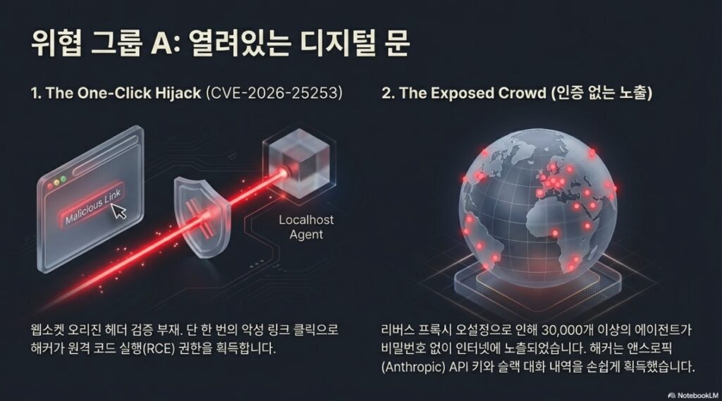 | WebSocket 하이재킹을 통한 원클릭 원격 코드 실행 (RCE) | CVE-2026-25253 위험 등급: Critical (8.0) | 로컬 서버가 WebSocket Origin 헤더를 검증하지 않아, 사용자가 악성 링크를 클릭할 경우 공격자가 실행 중인 에이전트에 연결하여 원격으로 코드를 실행할 수 있는 취약점입니다. |