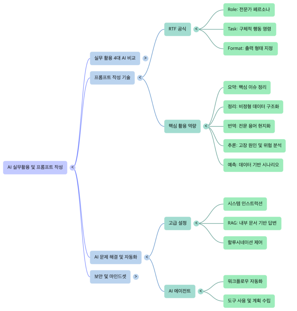 • 4대 AI 모델 최적화: 업무 목적에 따라 ChatGPT(멀티모달/데이터 시각화), Gemini(대규모 문서 분석), Claude(자연스러운 문장/논리 추론), Perplexity(출처 기반 검색)를 전략적으로 선택하여 활용해야 합니다.