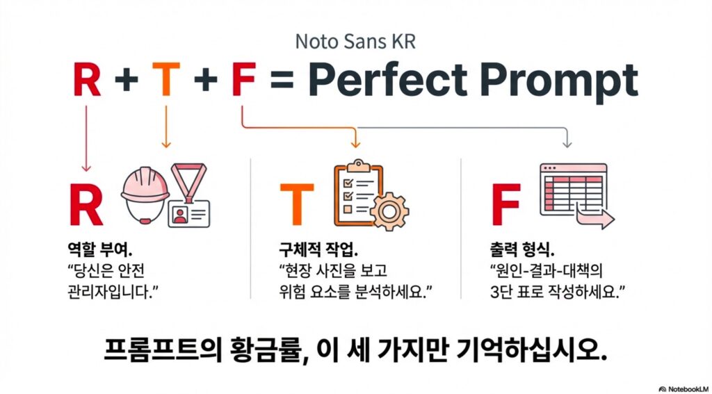 1. Role (역할): AI에게 구체적인 전문가 페르소나를 부여합니다. (예: “당신은 20년 경력의 안전 관리자입니다.”)