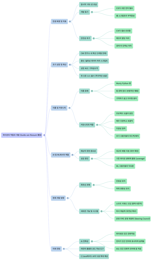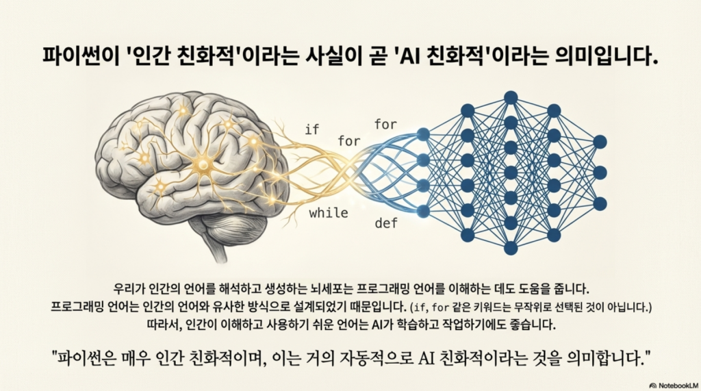 파이썬이 AI에 친화적인 이유는 역설적이게도 ‘인간에게 친화적’이기 때문입니다. 귀도 반 로섬은 이 통찰을 매우 흥미롭게 설명합니다. 그는 인간의 언어를 해석하고 생성하는 데 도움을 주는 **’동일한 뇌세포’**가 프로그래밍 언어를 이해하는 데도 도움을 준다고 말합니다.