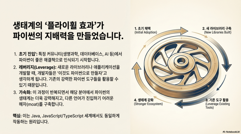 파이썬이 AI의 언어가 된 것은 의도된 설계가 아닌 ‘네트워크 효과’ 덕분이었습니다. 특히 머신러닝 커뮤니티에서 부동소수점 숫자로 이루어진 대용량 배열(large arrays of floating point numbers)을 효율적으로 지원하는 서드파티 라이브러리처럼 유용한 도구들이 파이썬으로 만들어지기 시작했습니다. 그러자 새로운 AI 프로젝트를 시작하는 개발자들은 이미 구축된 강력한 생태계를 활용하기 위해 자연스럽게 파이썬을 선택하게 된 것입니다. 이는 특정 목적을 위한 설계가 아닌, 커뮤니티에 의한 유기적인 성장의 결과였습니다.