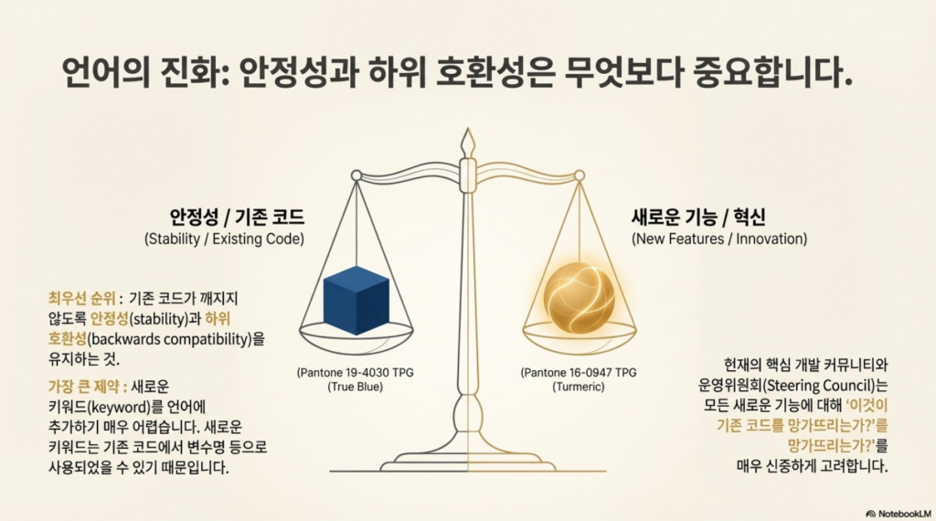 이미 수많은 사람이 사용하는 언어에 새로운 기능을 추가하는 것은 매우 어려운 일입니다. 특히 기존에 작성된 코드가 망가지지 않도록 ‘하위 호환성’을 유지하는 것이 중요합니다. 새로운 키워드(예약어)를 하나 추가하는 것만으로도 전 세계 수많은 프로그램이 오류를 일으킬 수 있기 때문입니다.