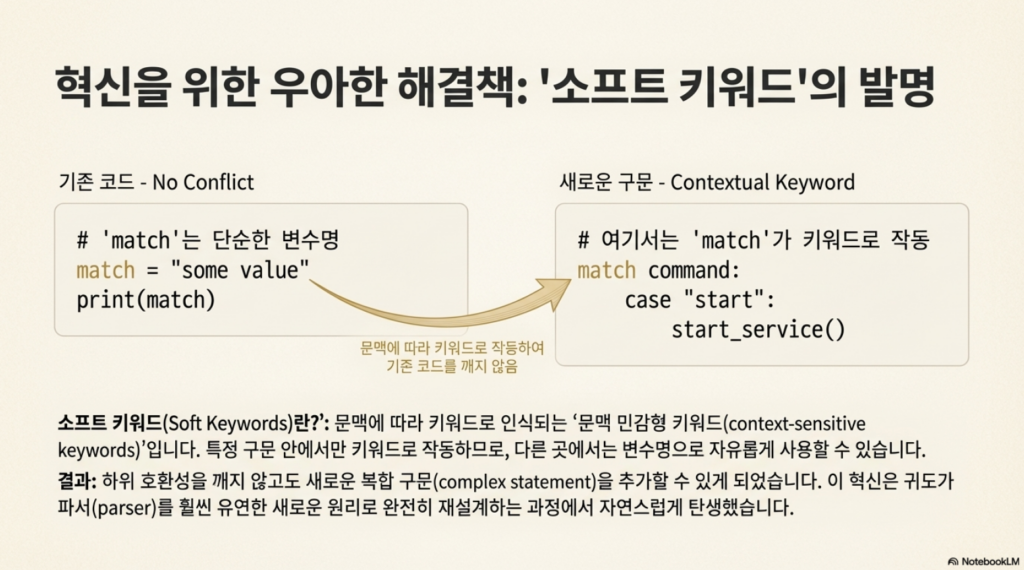 파이썬은 이 문제를 해결하기 위해 ‘소프트 키워드(soft keywords)’라는 영리한 개념을 도입했습니다. 소프트 키워드는 특정 문맥(context)에서만 키워드로 작동하고, 다른 곳에서는 일반 변수명처럼 사용할 수 있는 단어입니다. 흥미로운 점은 이 해결책이 특정 문제를 해결하기 위해 고안된 것이 아니라, 귀도 반 로섬이 전혀 다른 원리를 사용해 언어의 파서(parser, 코드 구조를 분석하는 엔진)를 근본적으로 재설계하는 과정에서 얻어진 ‘유익한 부수 효과’였다는 점입니다. 이러한 아키텍처 혁신 덕분에 파이썬은 안정성을 해치지 않으면서도 계속해서 발전할 수 있게 되었습니다.