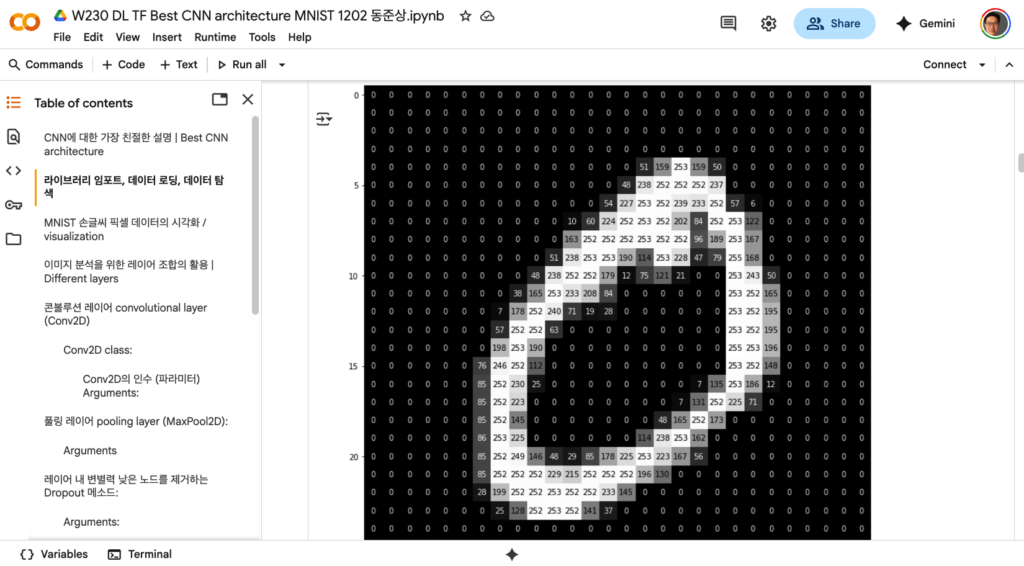 - 이번 코랩 노트북은 MNIST 손글씨 숫자 이미지 데이터셋을 대상으로 텐서플로(TensorFlow) 기반 합성곱 신경망(CNN) 모델을 설계·학습·평가하는 과정을 담고 있습니다.